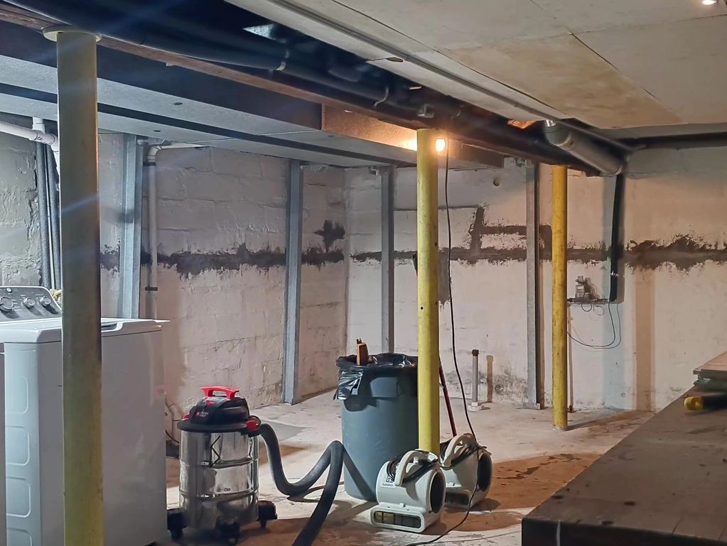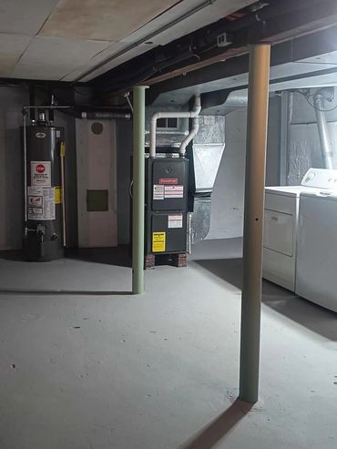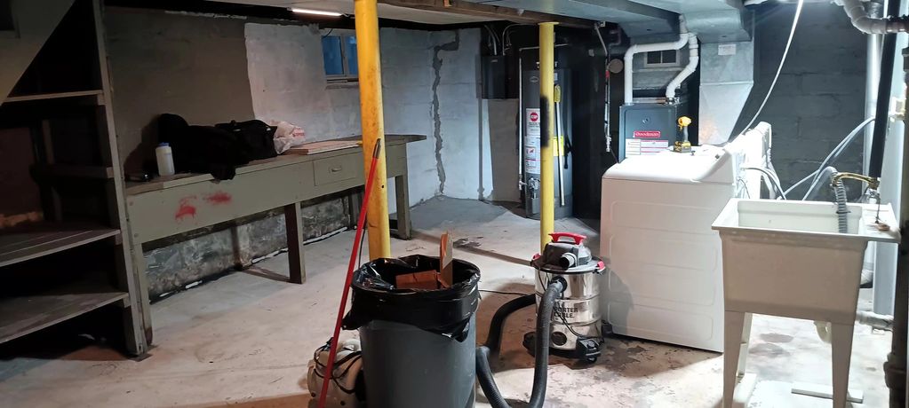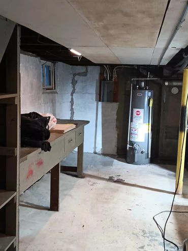 Before image showing that the foundation had been patched and bolstered previosuly by a third party. Walls were any number of colors and patch work was left unsealed. Excessive nails and hardware in the rafters and throughout were removed or secured for a cleaner and safer basement.