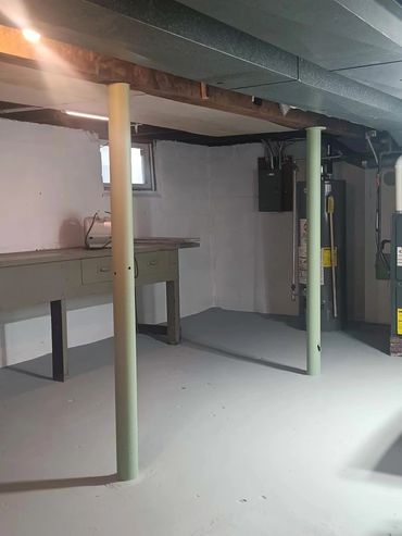 Clean and dry laundry area with walls and floor sealed and renewed. Sewer pipe painted accent color.