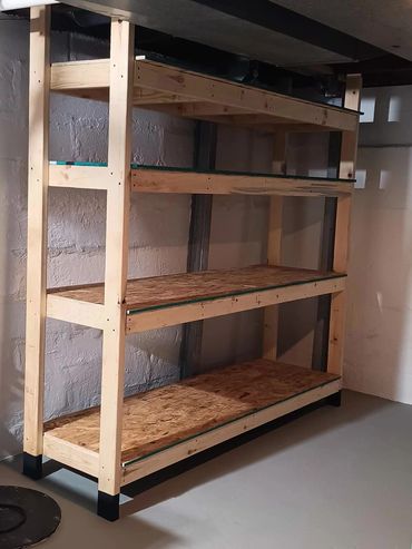 Plywood and 2x4 built in shelving unit. Legs were attached to the rafters above. Shelves were installed and leveled individually. Each leg had the bottom 4" treated with black oil based paint for longevity. Largely prefabricated in the shop and installed on site.