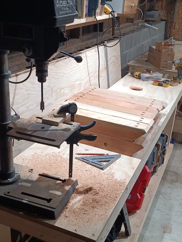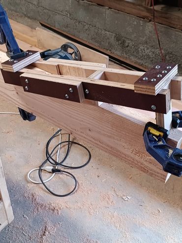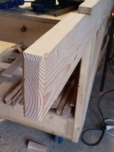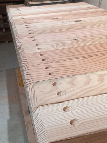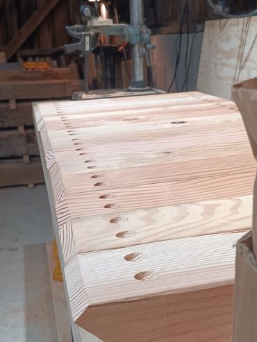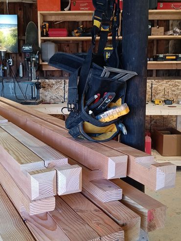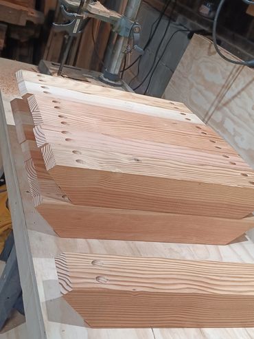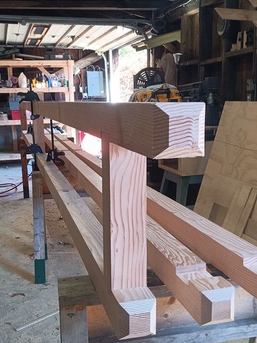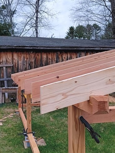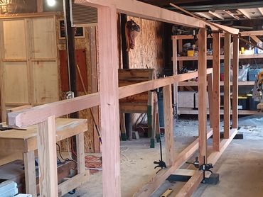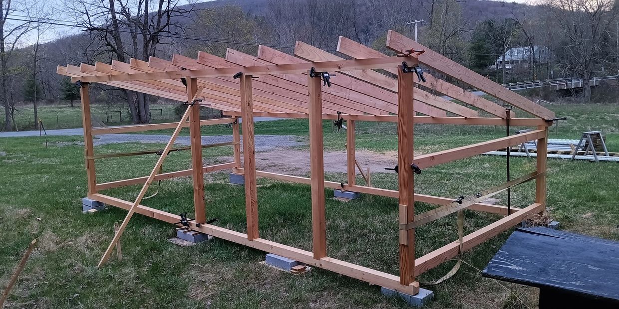 This chicken run kit was designed especially to mate with an existing chicken coup on the customer's land. All framing components were cut in the shop and dry fit just outside on leveled blocks. Dry fit images do not show the diagonal braces to be installed in each corner at time of on site build by 3rd party. Suitable for up to 20 chickens or more.